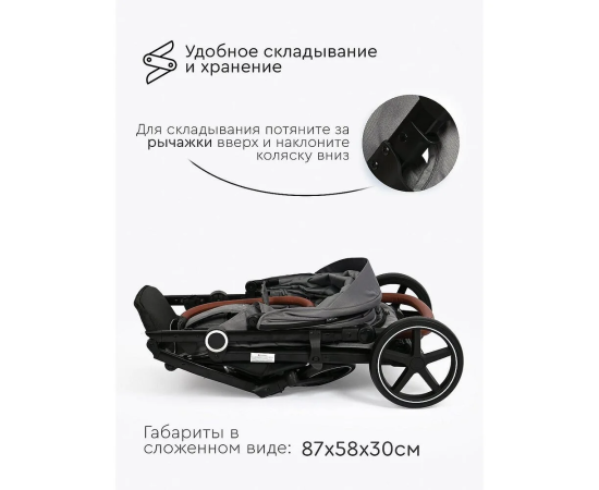 - Складывается книжкой. Потяните рычажки (на раме возле родительской ручки) вверх и наклоните коляску