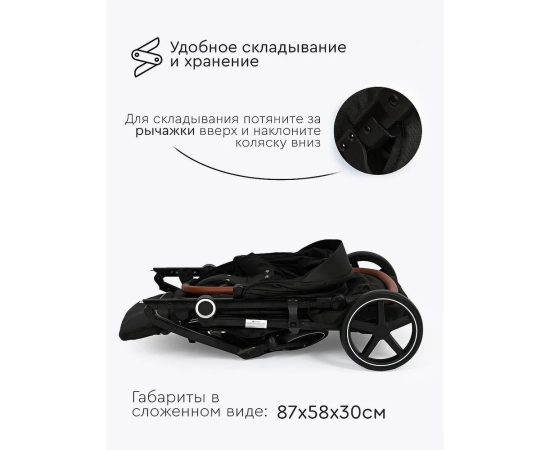 - Складывается книжкой. Потяните рычажки (на раме возле родительской ручки) вверх и наклоните коляску