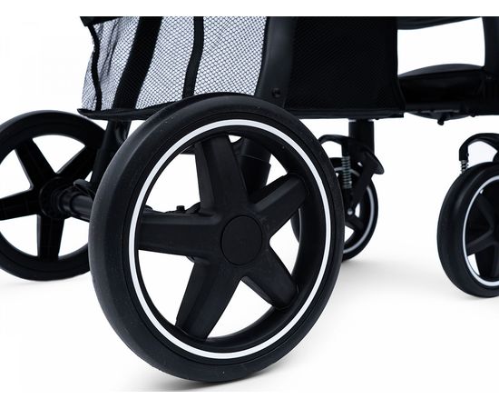 - поворотные передние колеса с амортизацией и возможностью блокировки диаметром 18 см, задние колеса – 28 см;