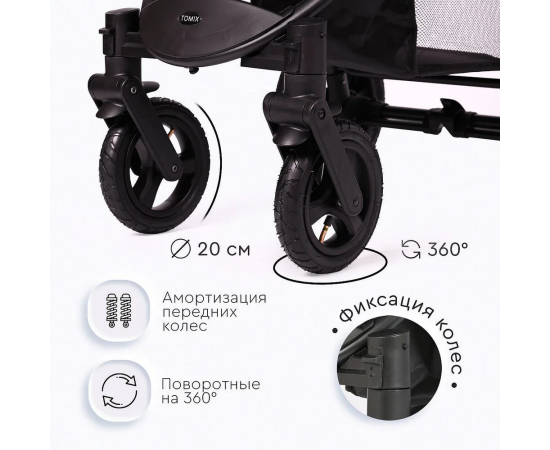 Передние колёса поворотные, с возможностью фиксации для поездок по бездорожью.