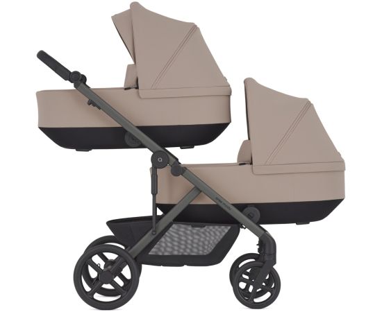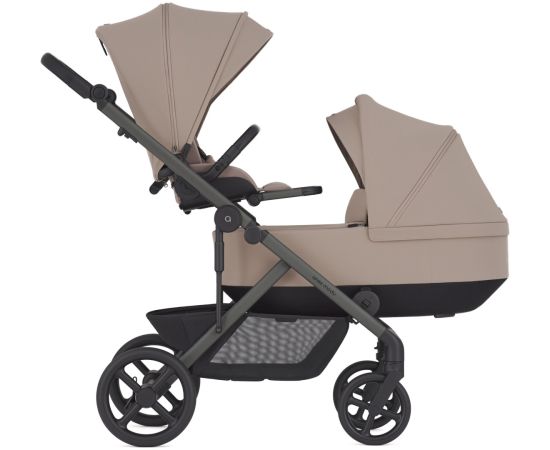 На одной компактной раме размещаются две полноценные сидячие части, люльки или автокресла. (*Дополнительные конфигурациии приобретаются отдельно.)