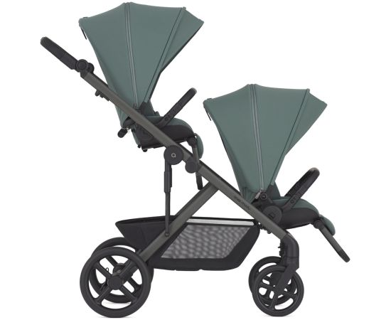 На одной компактной раме размещаются две полноценные сидячие части, люльки или автокресла. (*Дополнительные конфигурациии приобретаются отдельно.)