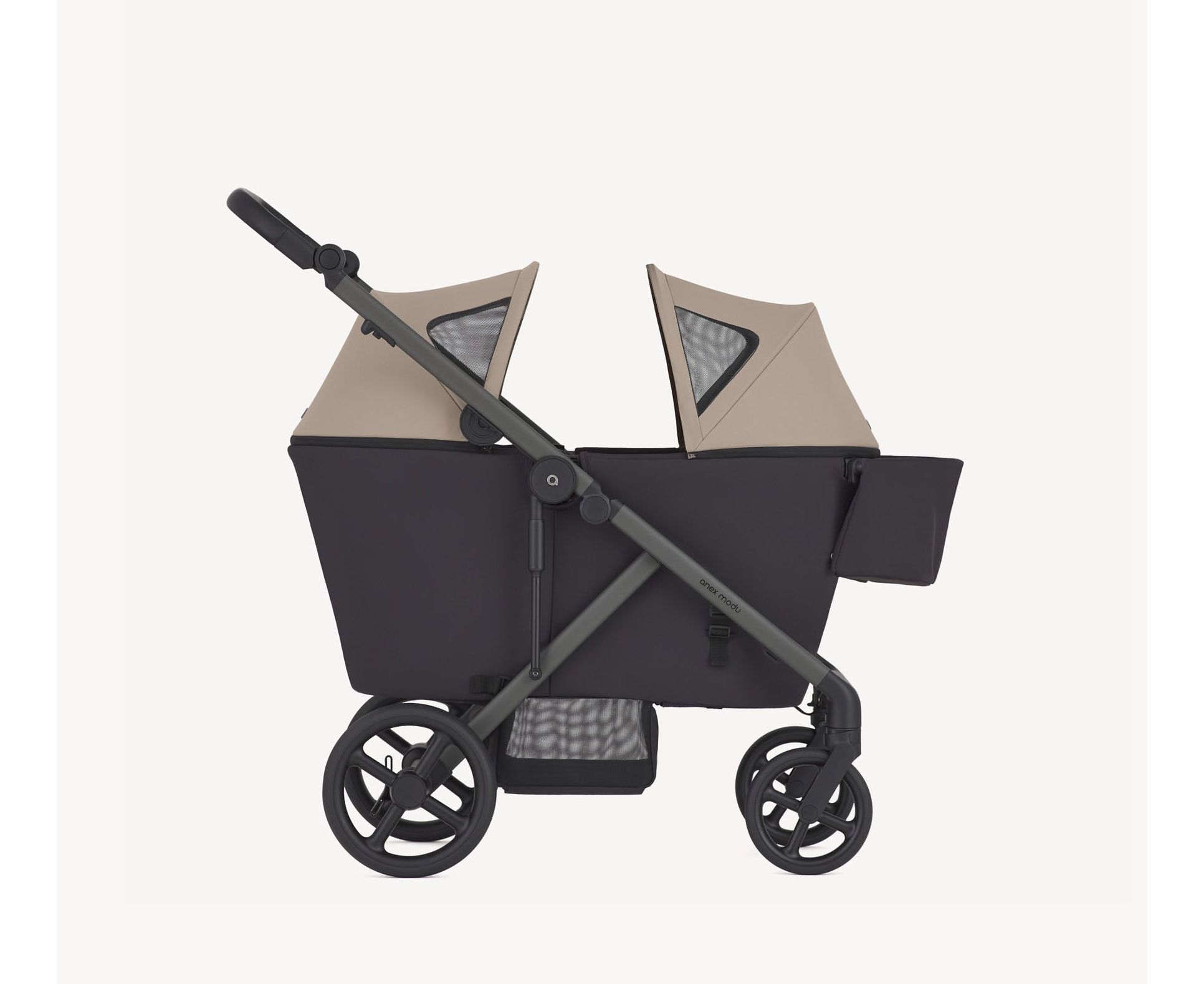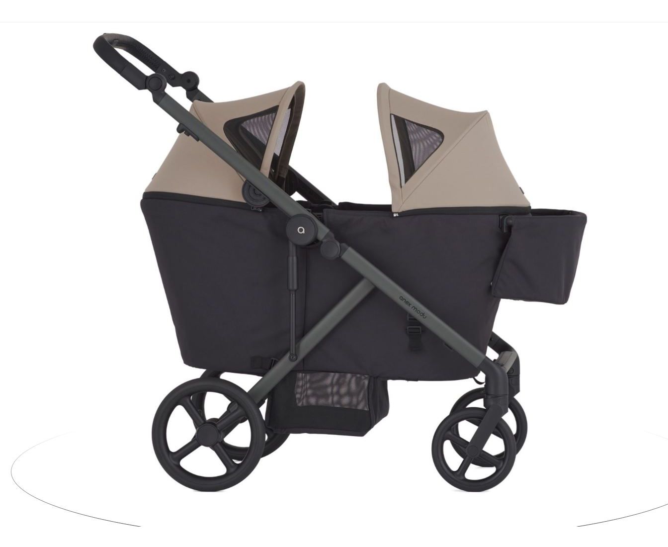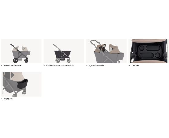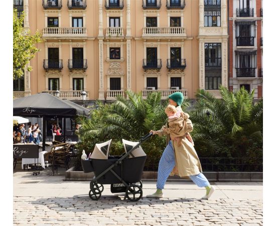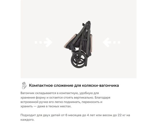 Коляска-вагончик это просторная и универсальная конфигурация для двух детей (от 6 месяцев до 4 лет или до 22 кг каждый). Дополнительное место для ног, съёмные капюшоны и столик — идеальное решение для активных малышей.