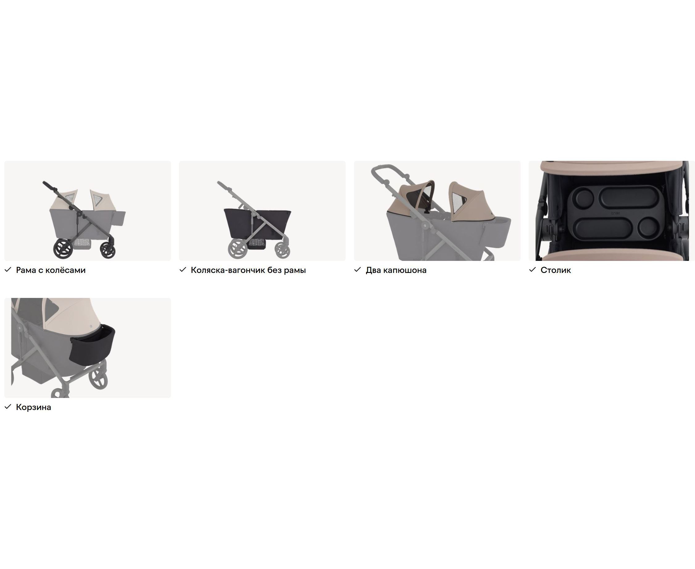 Поддерживает гибкие комбинации: две люльки, два сиденья, сиденье + люлька, два автокресла, коляска-вагончик и другие варианты. *Дополнительные конфигурации приобретаются отдельно.