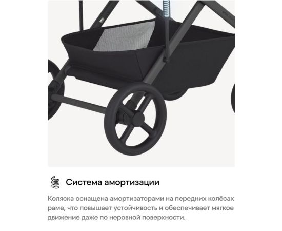 Коляска оснащена амортизаторами на передних колёсах и раме, что повышает устойчивость и обеспечивает мягкое движение даже по неровной поверхности.