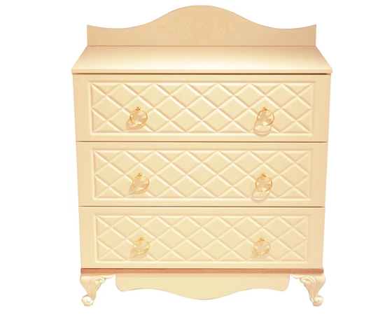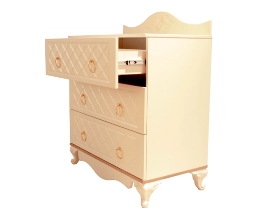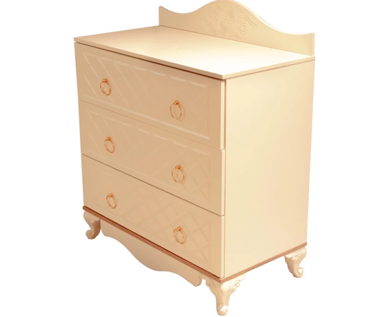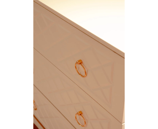 Комод "Miraj" изготовлен из качественного и долговечного материала. Фасады выполнены из МДФ, корпус ЛДСП. Все углы безопасны. Дерево покрыто безопасным лаковым покрытием, которое защищает от различных повреждений и позволяет надолго сохранить внешний вид изделия. Имеются ящики на направляющих, которые легко выдвигаются и очень вместительны. Комод декорирован изящными ручками. Колеса отсутствуют.