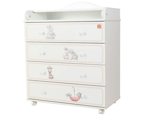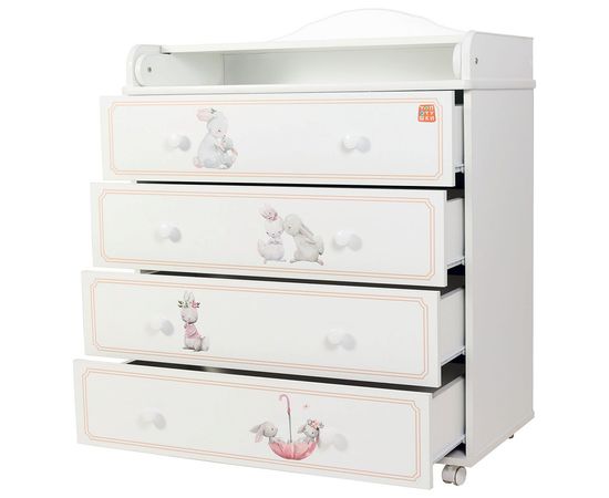 Пеленальный комод имеет откидную крышку, превращающую его в полноценный пеленальный столик. Когда малыш подрастёт, крышку можно будет снять. Комод имеет четыре вместительных ящика для хранения детских вещей. Комод можно передвинуть при необходимости благодаря колесам/