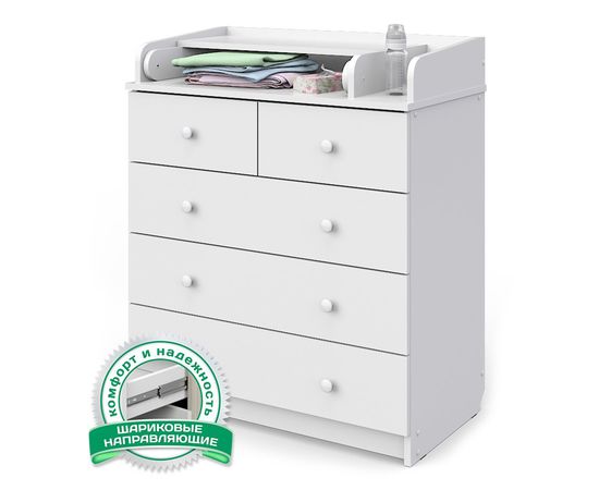 Главное преимущество детского комода СИРИУС-2 с пеленальным столиком от Атон Мебель – это отличные эксплуатационные свойства и высококачественная фурнитура. Шариковые направляющие на ящиках обеспечат полный комфорт от использования всего пространства комода. Благодаря специальной системе креплений ящики выдвигаются полностью и совершенно бесшумно. Кроме того, направляющие ящиков способны выдерживать достаточно большой вес в отличие от привычных роликовых.