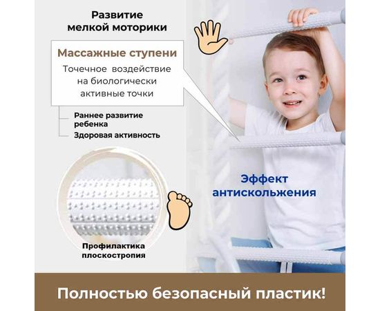 Массажные ступени из мягкого пластика, приятные на ощупь и всегда комнатной температуры, предотвращают скольжение рук и ног во время занятий и игр, и служат для профилактики плоскостопия у ребенка.