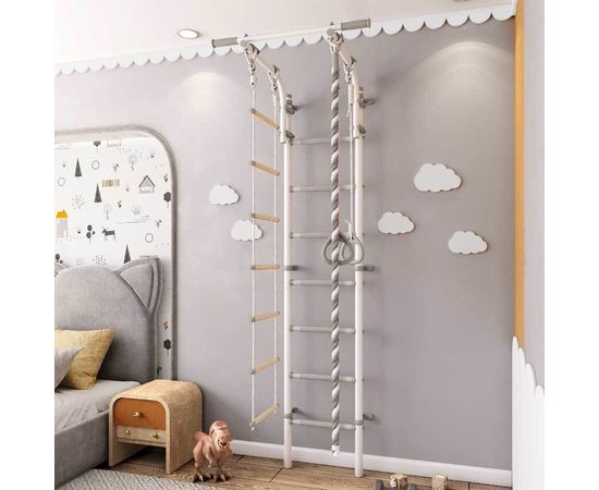 В детский спортивный комплекс входит навесное оборудование — веревочная лестница, канат, гимнастические кольца треугольной формы, которые не проворачиваются во время занятий.