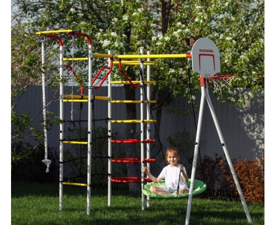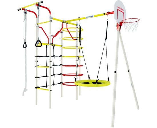 «Космодром» – это детский спортивно-игровой комплекс, который подойдет для дачного участка или двора вашего дома. Дает ребенку начальную физическую подготовку, помогает развить ловкость и гибкость. В комплекте: турник неподвижный, щит баскетбольный, канат, кольца гимнастические, кольцевой лаз, сетка для лазания, качели-гнездо.