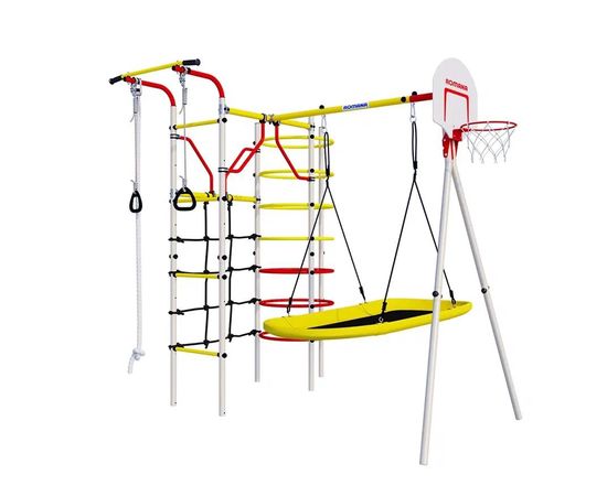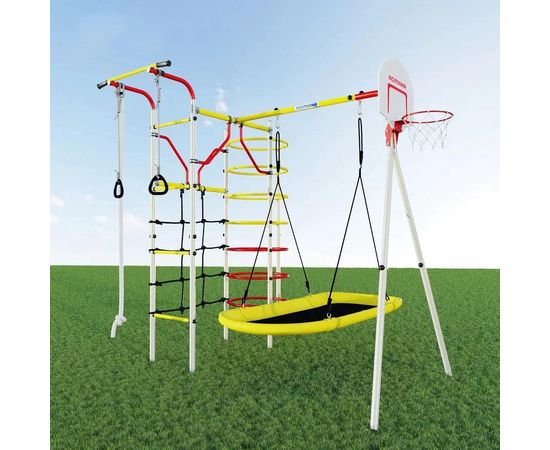 «Космодром» – это детский спортивно-игровой комплекс, который подойдет для дачного участка или двора вашего дома. Дает ребенку начальную физическую подготовку, помогает развить ловкость и гибкость. В комплекте: турник неподвижный, щит баскетбольный, канат, кольца гимнастические, кольцевой лаз, сетка для лазания, качели-лодка