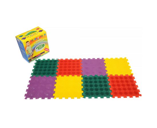 Массажные коврики представляют собой отдельные модули, которые соединяются между собой по принципу "пазл". Массажные элементы, расположенные на поверхности ковриков, имеют различную высоту и форму. Благодаря различной фактуре и жесткости поверхности, коврики стимулируют все необходимые рецепторы стопы ребенка, способствуя формированию ее физиологических сводов.