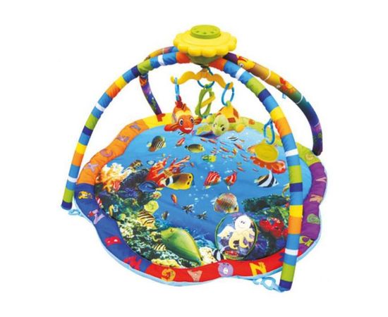 Развивающий коврик LaDiDa Подводный мир подходит для детей от 0 до 12 месяцев. Он изготовлен из мягкой набивной ткани. Бортики коврика позволяют защитить ребенка от случайных падений. Подвесные игрушки, которые позволяют развить хватательный рефлекс, а также координацию движений. Дуги легко снимаются.
