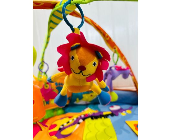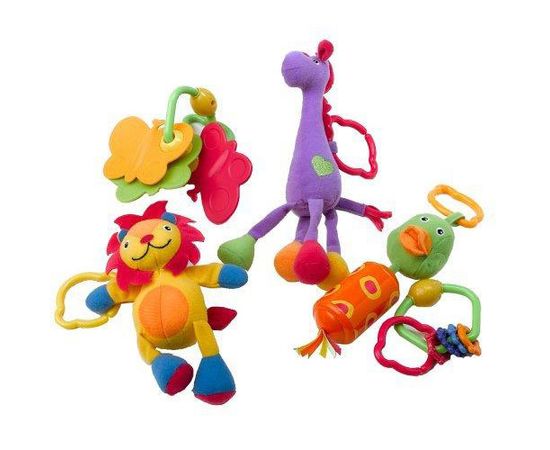 Большой интерес для малыша представляют дуги, еще бы, ведь на них висят 5 игрушек: ― мягкая погремушка жираф; ― мягкая погремушка львенок; ― утенок-"колокольчик"; ― прорезыватель с тремя разноцветными бабочками или листочками; ― пластиковая погремушка-прорезыватель с 4 колечками.