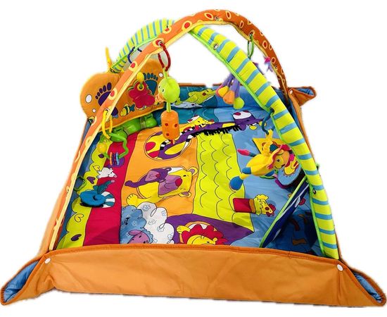 В центре коврика нарисован ковчег с животными, который плывет по воде. Эти животные представляют большой интерес для малыша — они сами игровые элементы для развития мелкой моторики и сенсорного восприятия ребенка. Хвостик одной из белок — шуршит в руках, у жирафа ― мягкая грива, нажав на овечку, можно услышать писк, а воздушный змей — шуршалка. Кроме того, под ним ребенок найдет пчелок, и мягкий бантик на ниточке. Рядом с облачком также находится солнышко-шуршалка, скрывающее за собой птичку. А еще на солнышко и рыбку, находящуюся ниже, можно прикрепить игрушки.