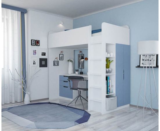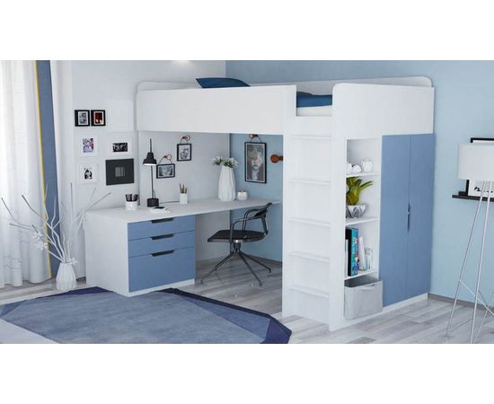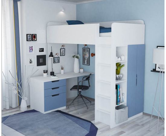 Кровать - чердак Polini Simple с письменным столом и шкафом белый-синий