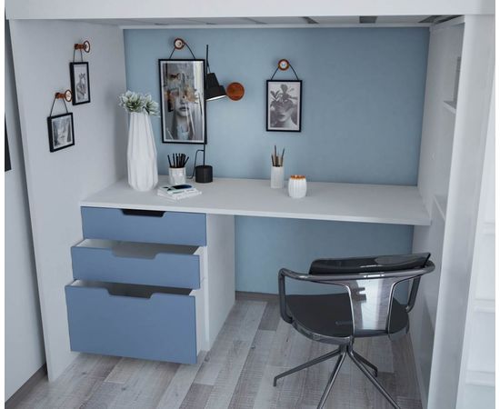 Письменный стол имеет глубокие ящики, выдерживающие вес до 15 кг. Стол имеет специальные отверстия,чтобы скрыть провода компьютера и других гаджетов. Его можно устанавливать параллельно или перпендикулярно кровати.
