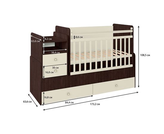 Общий размер детской кровати (ВхДхШ): 108,5х173,2х63,8 см.