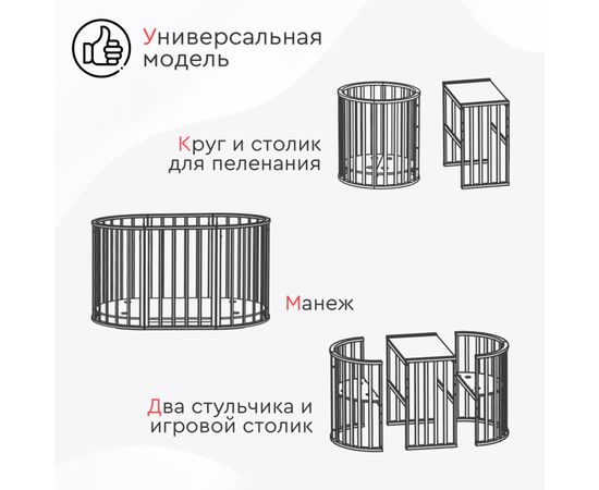 Кроватка растет вместе с ребенком и имеет несколько вариантов трансформации: