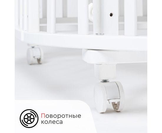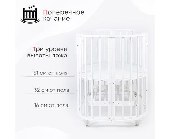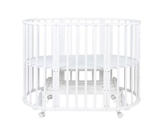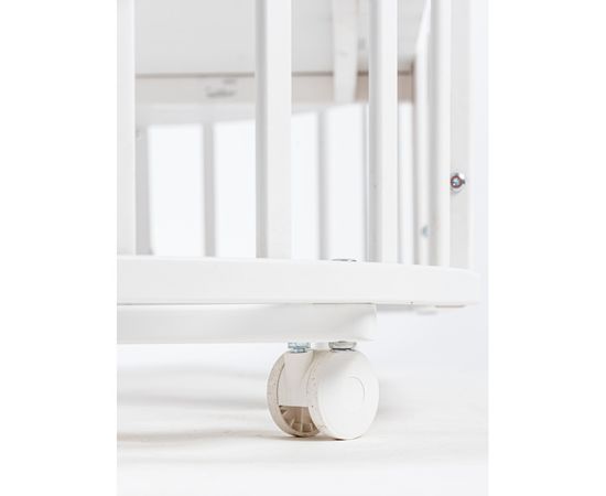 Ложе кровати регулируется по высоте в 3 положениях (51, 32 и 16 см от пола). В колыбели ложе устанавливается в самом верхнем положении, благодаря чему малыша удобно брать из кроватки. Когда ребенок научится сидеть, колыбель трансформируется в овальную кровать и ложе устанавливается на средний уровень. В дальнейшем можно установить ложе на нижний уровень и использовать кровать в качестве манежа. Кровать оснащена 4 колёсами с возможностью фиксации и установки в различных положениях (для круглой и овальной кроватки).