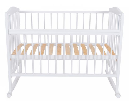 Кровать оснащена механизмом опускания передней планки, что облегчает уход за младенцем. Реечное дно способствует хорошей вентиляции матраса.