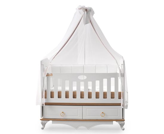 Конструкция кроватки состоит из регулируемого ложа (2 уровня высоты), спинок, бортиков, механизма-маятника. Имеются 2 вместительных выдвижных ящика. Стильный декор и изящные фигурные ножки добавят изящности в ваш дом.