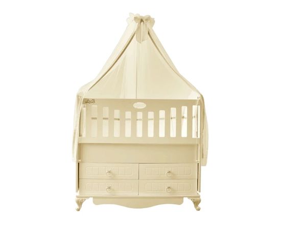 Конструкция кроватки состоит из регулируемого ложа (2 уровня высоты), спинок, бортиков, механизма-маятника. Имеются 4 вместительных выдвижных ящика, декорированных изящными ручками в виде жгутов. Стильный декор и изящные фигурные ножки добавят изящности в ваш дом.