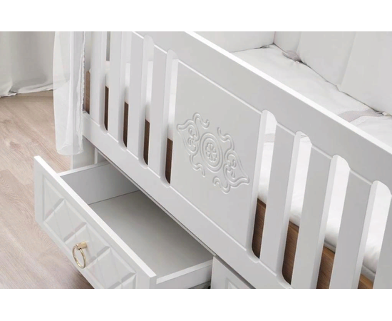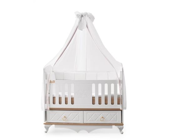 Конструкция кроватки состоит из регулируемого ложа (2 уровня высоты), спинок, бортиков, механизма-маятника. Имеются 2 вместительных выдвижных ящика. Стильный декор и изящные фигурные ножки добавят изящности в ваш дом.