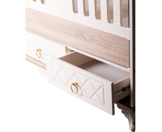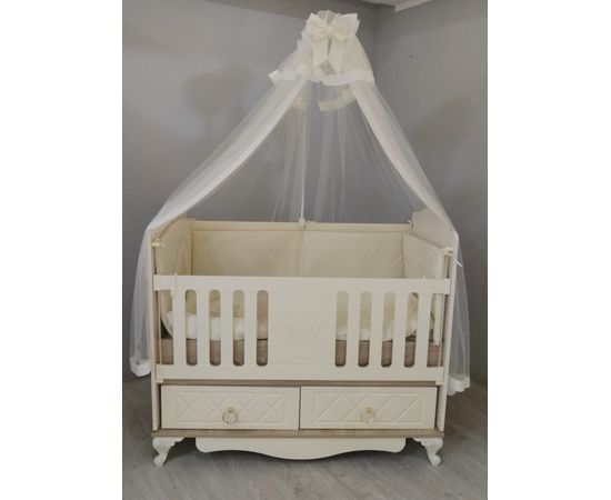 Конструкция кроватки состоит из регулируемого ложа (2 уровня высоты), спинок, бортиков, механизма-маятника. Имеются 2 вместительных выдвижных ящика. Стильный декор и изящные фигурные ножки добавят изящности в ваш дом.