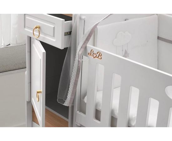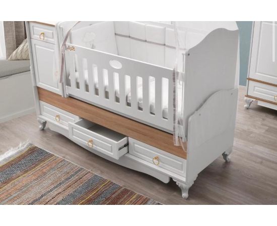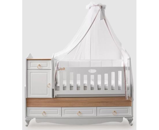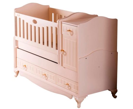 Детская кровать-трансформер "Carla" представляет собой комплекс полезных элементов. Конструкция состоит из спального места, комода, пеленального столика, ящиков и полочек. Они объединены в одно целое.