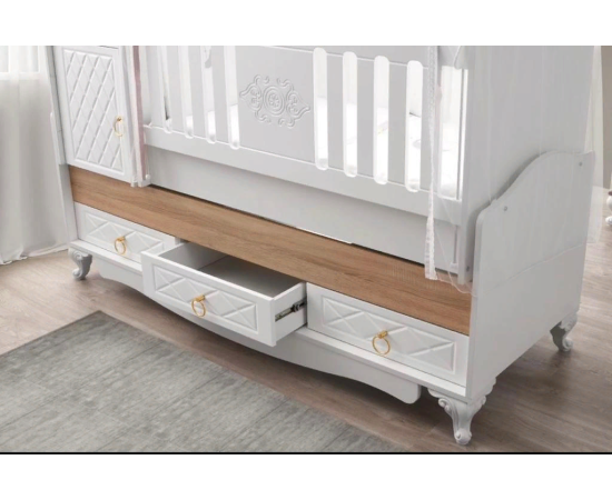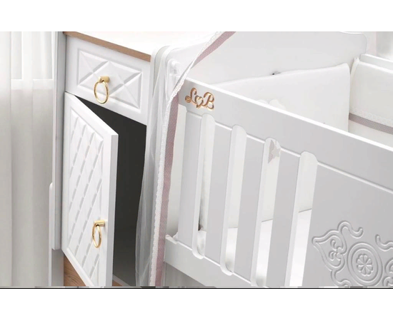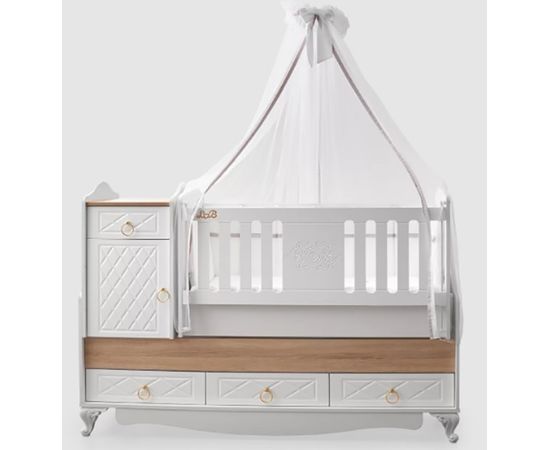 Детская кровать-трансформер "Miraj" представляет собой комплекс полезных элементов. Конструкция состоит из спального места, комода, пеленального столика, ящиков и полочек. Они объединены в одно целое.