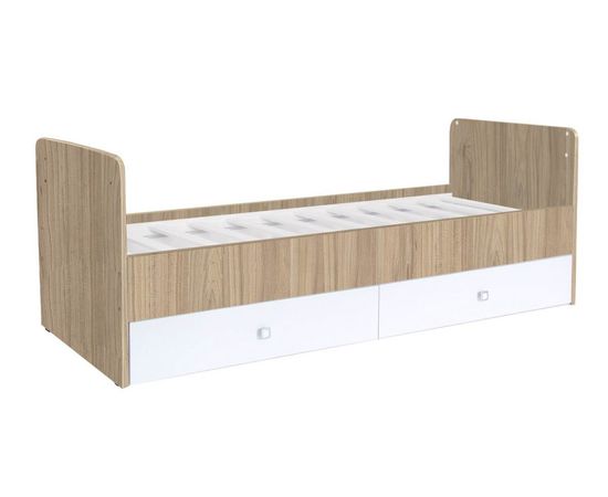 - 5 вместительных выдвижных ящиков для одежды и игрушек (два больших ящика в кровати, три ящика в тумбе)