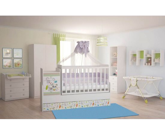 Модель оснащена ортопедическим ложем для правильного развития ребенка.Передняя стенка кроватки с опускающейся верхней планкой для удобного доступа к новорожденному малышу.