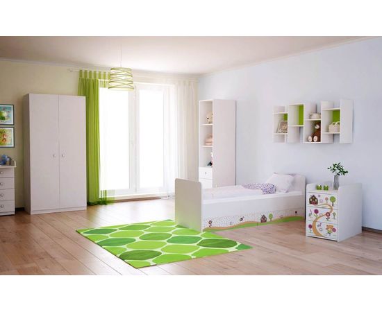 - ортопедическое основание, • включает в себя 2 положения ложа, • 5 вместительных выдвижных ящиков (2-больших ящика в кровати, 3- ящика в тумбе),