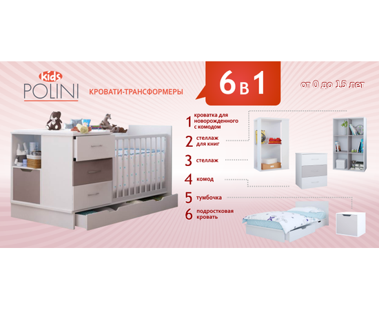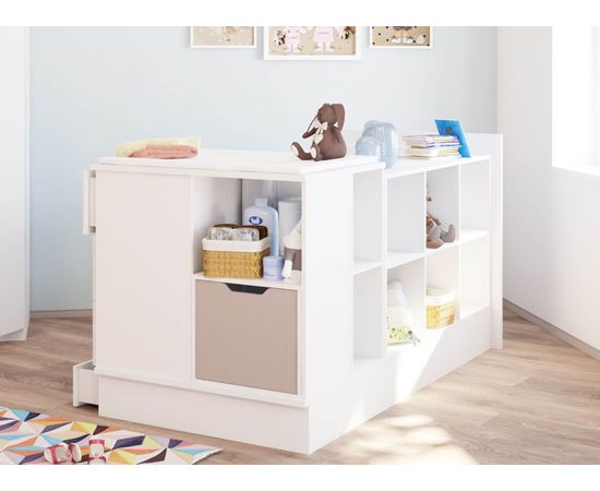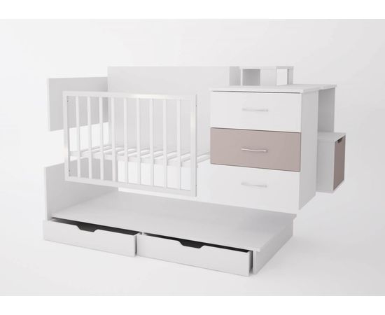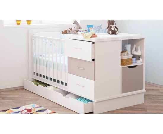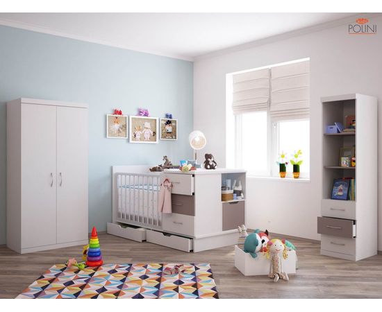 Универсальная и эргономичная модель, совмещающая в себе удобство и безопасность мебели для новорожденного, а также функциональность мебели для детей и подростков. Сочетание белого и макиато в корпусе и фасадах создает уникальный интерьер в европейском стиле.