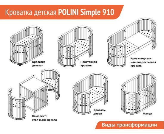 Кроватка круглая детская Polini Simple 910 - современная модель кроватки-трансформера, которая трансформируется в целых 8 предметов: