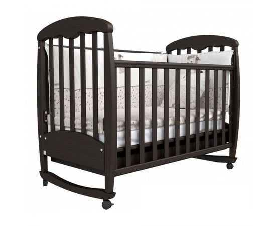 Кроватка Соня ЛД 1 Верес – детский манеж в классическом стиле с четырьмя колесиками, также кроватку можно поставить на полозья, для легкого укачивания малыша. Кроватка не имеет острых углов, а дно изготовлено из ортопедических ламелей — что обеспечивает достаточную вентиляцию матрасика и постельного белья. 2 уровня дна, опускающаяся боковина и удобный ящик для белья. Позже кроватка трансформируется в уютный диванчик.