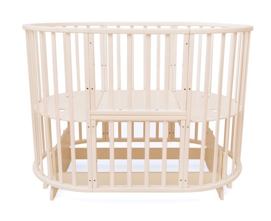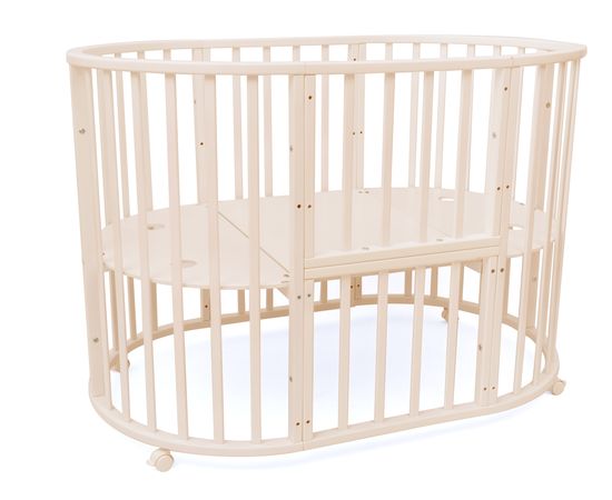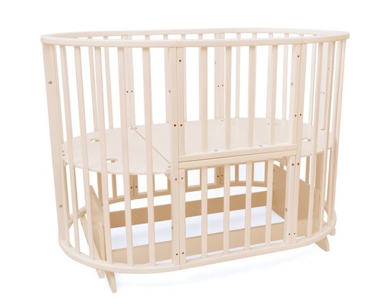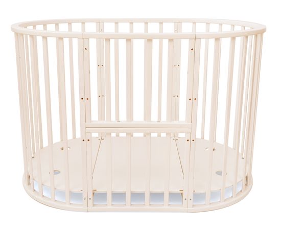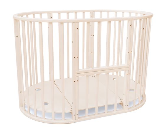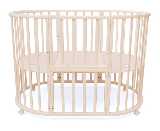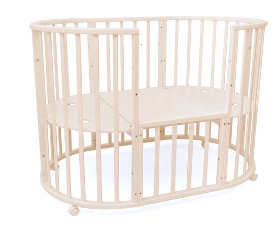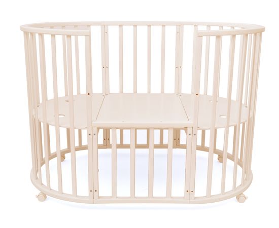 Функциональная овальная кроватка-трансформер 9 в 1 Tomix Epica станет отличным приобретением при рождении малыша. До 6 месяцев удобно использовать круглую кровать-колыбель, в которой малышу будет уютно и комфортно, и пеленальный столик для гигиенических процедур. Когда кроха подрастет, можно собрать овальную кровать. Причем съемная передняя стенка у овальной кровати позволяет использовать кровать как приставную к взрослой кровати. Также детская кроватка может выполнять функцию манежа при опускании ложа на самый нижний уровень. Для подросшего ребенка можно собрать игровой столик и 2 стульчика.