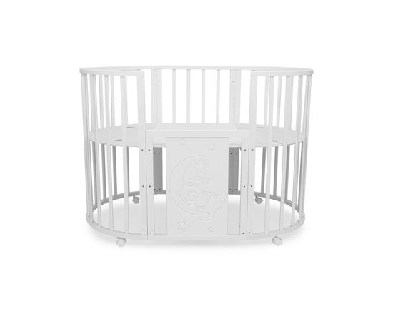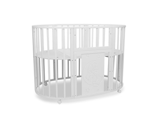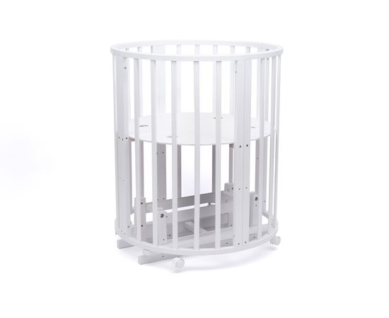 Ложе кровати регулируется по высоте в 3 положениях. В колыбели ложе устанавливается в самом верхнем положении, благодаря чему малыша удобно брать из кроватки. Когда ребенок научится сидеть, колыбель трансформируется в овальную кровать и ложе устанавливается на средний уровень. В дальнейшем можно установить ложе на нижний уровень и использовать кровать в качестве манежа.