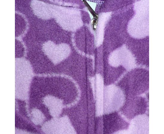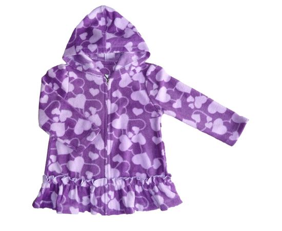 Куртка флисовая фиолетовая в сердечко - модель с капюшоном и широким воланом по низу изделия, застежка на молнию. Край волана обработан под закрутку. Состав:100%ПЭ(флис).