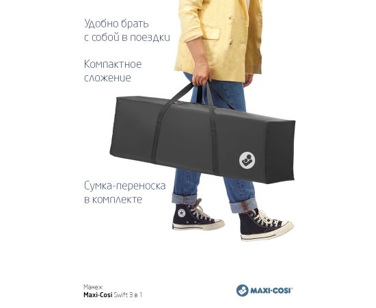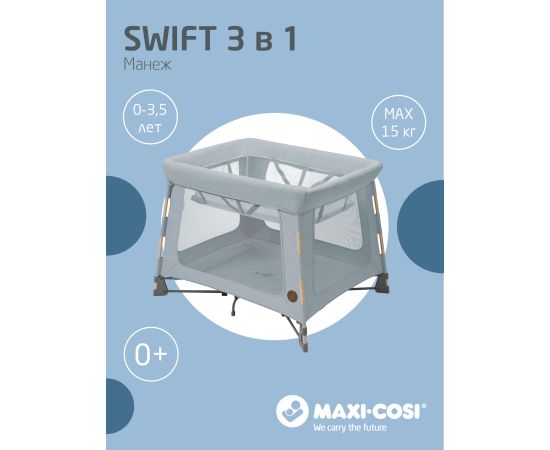 Maxi-Cosi Swift растет вместе с вашим ребенком от рождения до 3,5 лет. Чтобы не покупать три отдельных портативных продукта (люльку, детскую кроватку и игровой манеж), Swift представляет собой все три, стильно объединенные в одно целое.