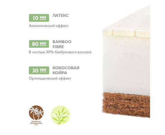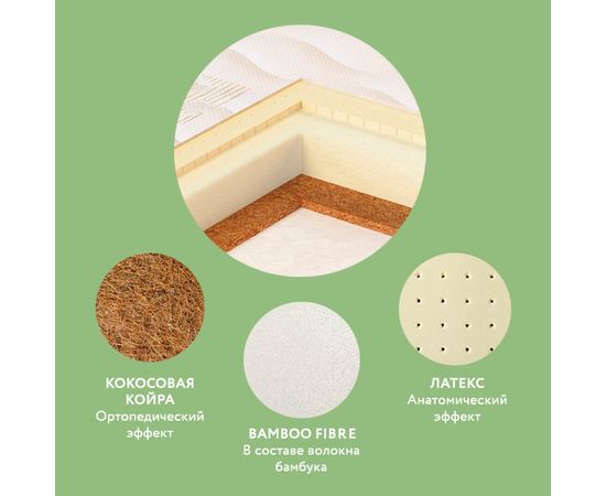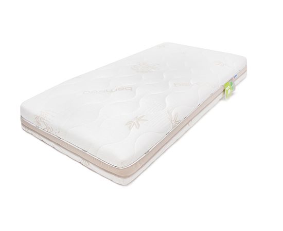 На другой стороне находится слой латекса, эластичного природного материала, который способствует точечному распределению нагрузки. Эта сторона предназначена для сна после года. В основе матраса гипоаллергенный материал Bamboo Fibre. Бамбуковые волокна в его составе известны своими антибактериальными свойствами.