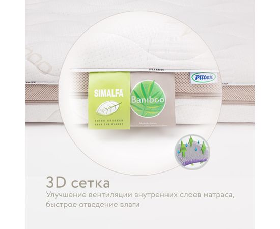Шелковистый стеганый чехол на молнии по трем сторонам упрощает уход за матрасом, а специальная 3D-cетка создает дополнительную вентиляцию. К тому же, поверхность матраса выполнена из натуральной бамбуковой ткани и обладает отличной терморегуляцией.