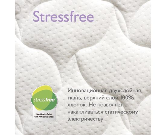 Съемный чехол матраса – двухслойный, прочный трикотажный материал StressFree – инновация на рынке матрасов. Верхний слой StressFree – 100% хлопок высшего качества, нижний слой – пористый, дышащий. Плотная стежка делает чехол воздушным, а специальная обработка ткани придает ей антистатический эффект. Статический заряд, возникающий от трения тканей постельного белья и пижамы, быстро и незаметно снимается с тела ребенка и выводится в воздух. Это успокаивает нервную систему и нормализует сон. Матрас рекомендуется детям в возрасте от 0 до 3 лет.