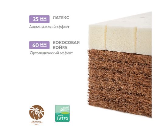 Универсальный беспружинный матрас премиум-класса двусторонней жесткости. В матрасе используется классическое сочетание лучших, экологически чистых натуральных наполнителей: анатомического латекса и латексированной кокосовой койры. Они обладают идеальными для наполнителей матрасов свойствами: естественной вентилируемостью, упругостью, абсолютной гигиеничностью, антиаллергенностью и долговечностью. Жесткая кокосовая сторона идеально подойдет новорожденным, обеспечит правильное формирование позвоночника. После года ребенка можно укладывать на более мягкую сторону из латекса, она легко подстраивается под форму тела. Полностью натуральные наполнители создают идеальный для сна микроклимат.