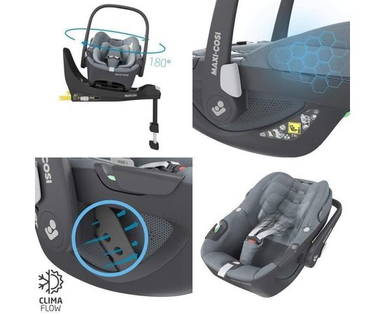 Автокресло Maxi-Cosi Coral 360 для новорождённых представляет собой инновационную модульную конструкцию и первое модульное детское автокресло с поворотом на 360 и сочетает в себе современные стандарты безопасности.