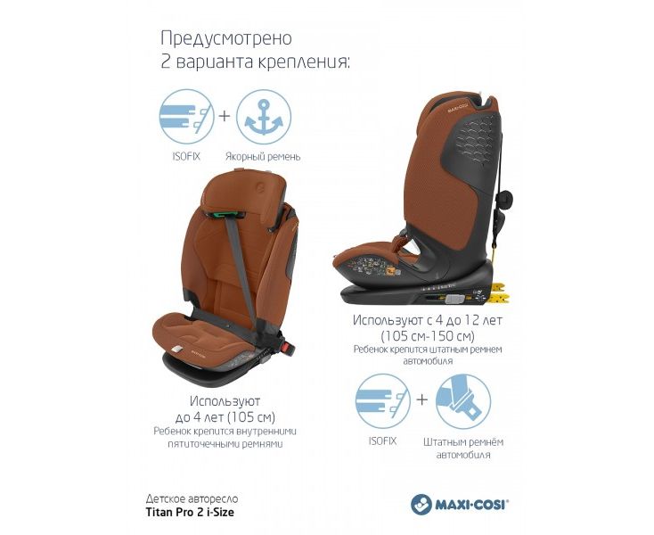 - Titan Pro i-Size: это автокресло группы 1-2-3 быстро и легко устанавливается в большинство автомобилей с помощью крепления ISOFIX и якорного ремня.