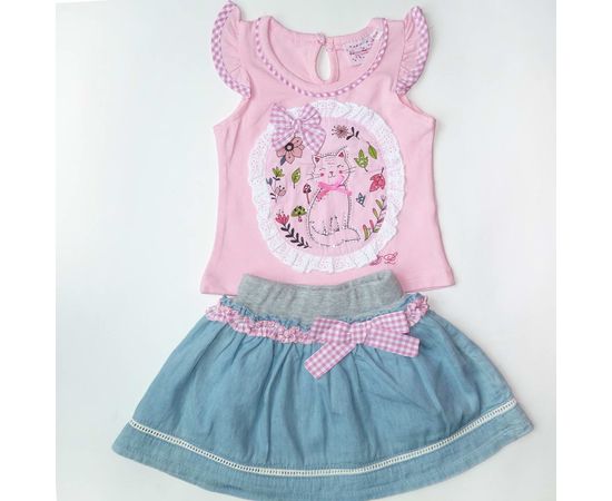 Набор 2в1 Юбка+футболка Кот в круге арт86145. Юбочка джинсовая на трикотажном широком пояске, футболка расшита стразами, 95% хлопок. 5% спандекс. Очень нарядный и милый.