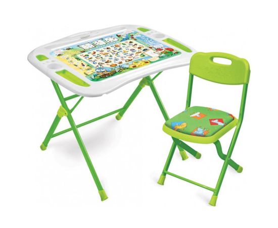 Комплект складной мебели Ника. Яркие рисунки на столе привлекут внимание ребенка и помогут быстро выучить азбуку. Обратите внимание на плавные линии стола. на столе можно рисовать маркером на водной основе Большие органайзеры с обеих сторон помогут ребенку организовать свое рабочее место. Предусмотрена выдвижная подставка для книг. Комплект выполнен из метала и пластика. Полностью безопасен для ребенка. Для детей в возрасте от 3 до 7 лет. Поверхность стула мягкая, протирающаяся